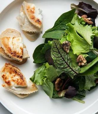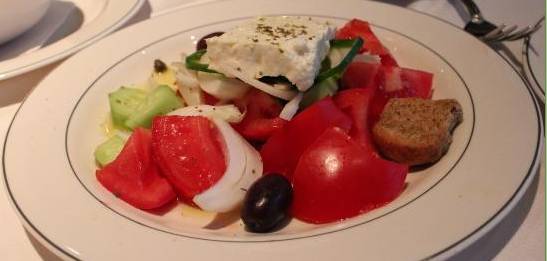 由西红柿、洋葱、黄瓜、青椒、橄榄组成,上面顶着一大块厚厚的羊奶酪,清爽可口。