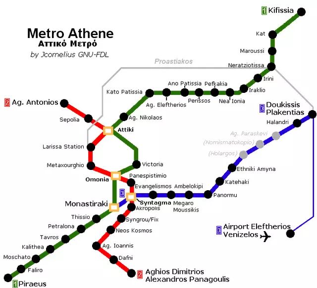 雅典拥有着被誉为欧洲最具艺术感的地铁交通系统,主要由3条线路构成,辐射范围覆盖了市区的大部分景点,每天从5:30运营到23:30。目前除3号线Doukissis Plakentias站以东的路段外,雅典地铁的单程票均为1.4欧元,持票者不仅可以无限次换乘各条地铁线路,还可以在90分钟的有效期内用单程票免费换乘市内的有轨电车和公交车。