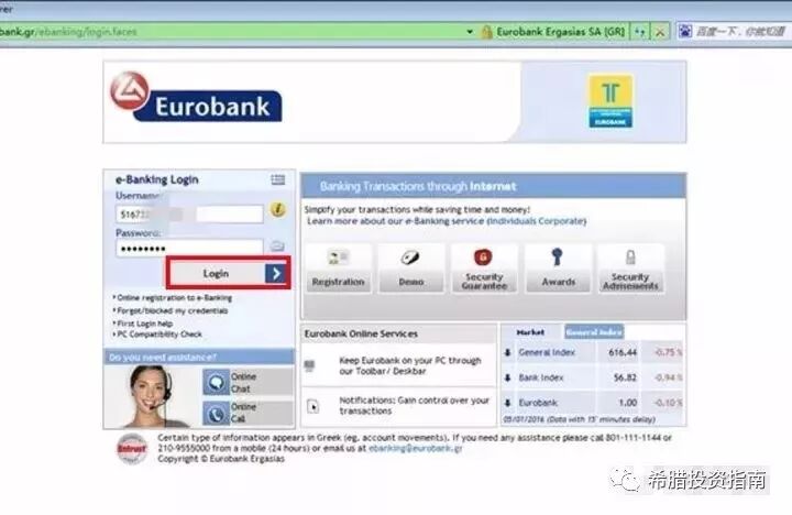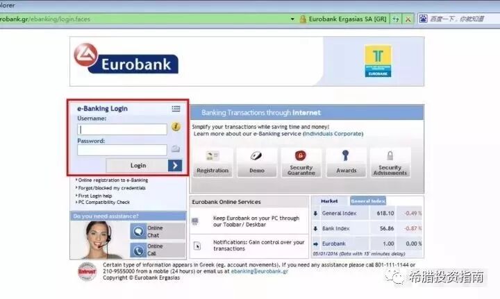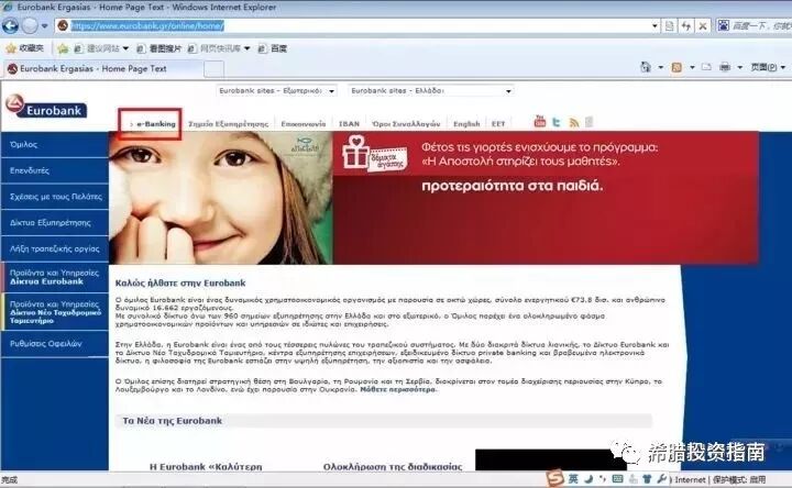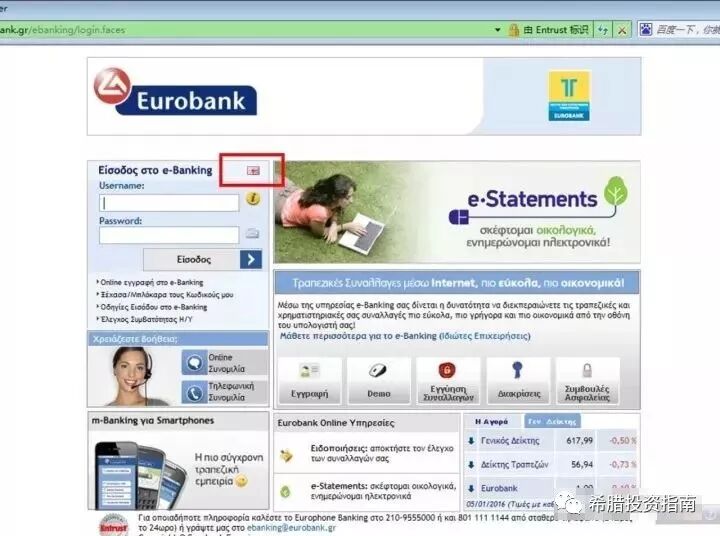 1、使用 Windows 系统自带的 IE 浏览器,登陆https://www.eurobank.gr, 进入以下页面: