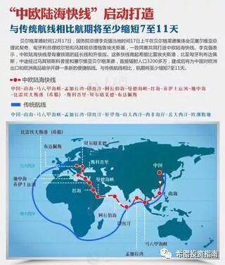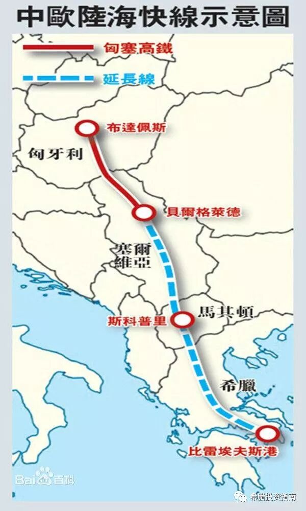 中欧陆海快线 :南起希腊比雷埃夫斯港,中途经过马其顿斯科普里和塞尔维亚贝尔格莱德,北至匈牙利布达佩斯,在布达佩斯可接通欧盟既有铁路网络,通往东、西欧各国。