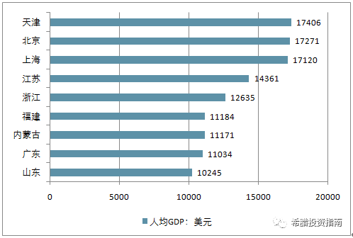 我们来看看他的人均GDP,根据2016年的统计数据显示为18104美元,而同样出自2016年统计数据显示我国人均GDP超一万美元的省份如下图所示: