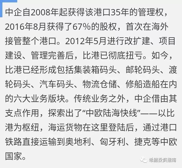 其中,比雷埃夫斯港的合作是互联互通合作的范例。雅典和克里特岛的机场项目、比雷埃夫斯港和中欧间的铁路项目、持股希腊国家电网等持续创新中希在基础设施、交通方面的合作方式。