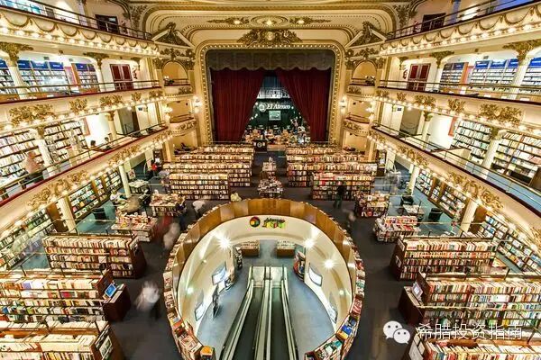 雅典人书店是阿根廷的老字号连锁书店,在布宜诺斯艾利斯有八家分店,其中闹市区的这家最负盛名,它建在一座古老的歌剧院旧址上,环境优雅古朴。书店内的雕塑与壁画均出自名师之手,天花板、希腊式柱子、精美浮雕、欧式吊灯以及舞台基本都保留了下来,而大厅里的坐席被撤走,放上了一排排书架。