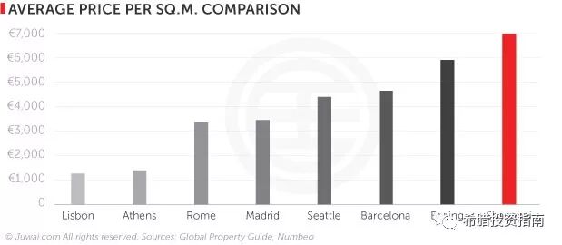 几大房地产投资热土房产均价对比图,雅典以每平米2000欧元左右(约人民币15000)的均价排位倒数第二,而排名最前的则是中国上海,每平米均价高达7000欧元(约人民币52000)。
