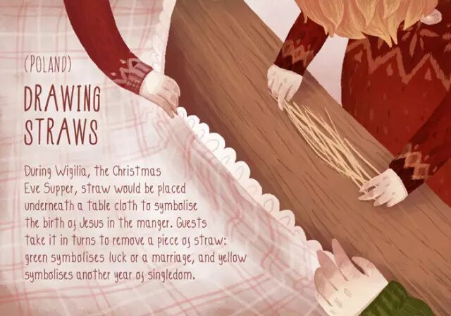 在准备圣诞前夜的晚餐时,人们会把稻草放在桌布下面,象征着耶稣诞生于马槽中。用餐时,人们会挨个从桌布下抽出一根稻草,如果抽到绿色稻草象征着好运或婚事将近,如果抽到黄色稻草象征着又将单身一年。