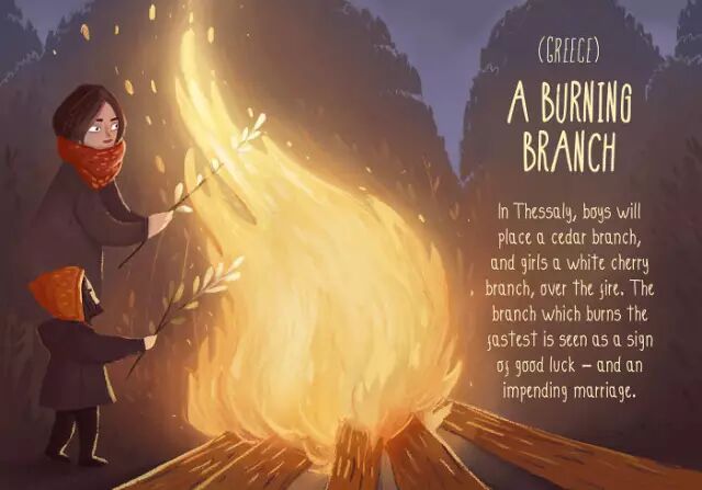 在塞萨利,男孩们会把雪松枝放在火上烧,女孩们则把白樱花枝放火上烧,谁的树枝最快烧光,谁的运气就要来了,婚事也指日可待。