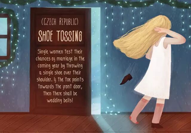 未嫁的姑娘将一只鞋从肩头向后甩,如果鞋尖冲着前门,那么她很快就能嫁出去。