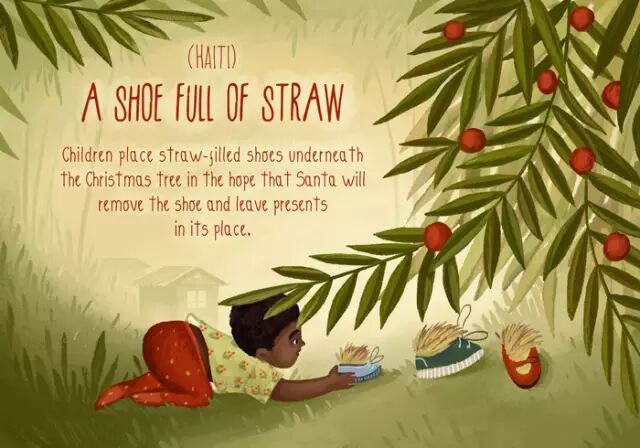 孩童们把装满稻草的鞋子放在圣诞树下,希望圣诞老人能把鞋拿走,在原地留下圣诞礼物。