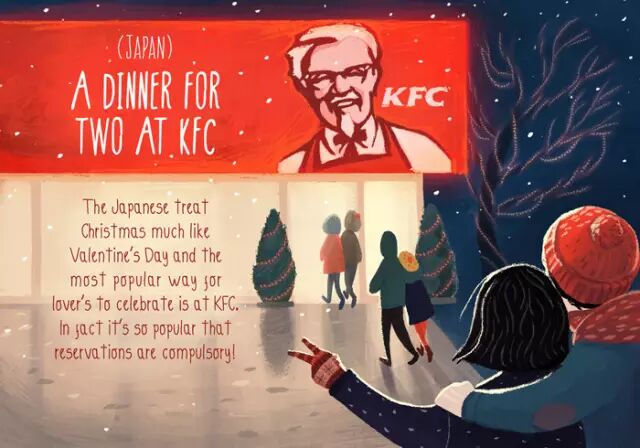 圣诞节对日本人来说和情人节差不多。情侣们最喜欢去肯德基共度圣诞,想去的人都得提前订位。