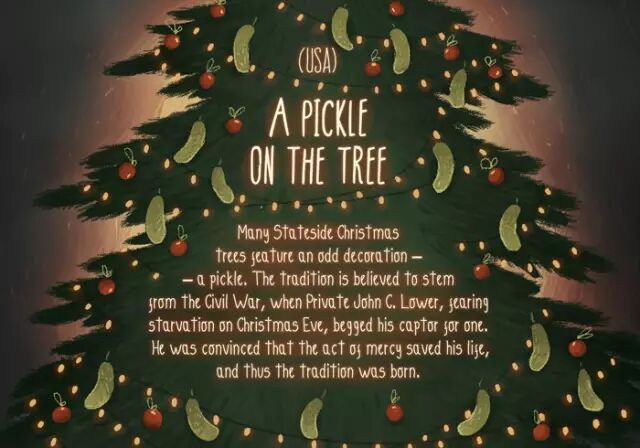 据说该传统起源于美国南北内战时期。当时一名被俘的二等兵约翰·C·洛厄在圣诞前夜快要饿死了,请求俘虏他的人给他一根腌黄瓜。他相信这根腌黄瓜救了他的命。