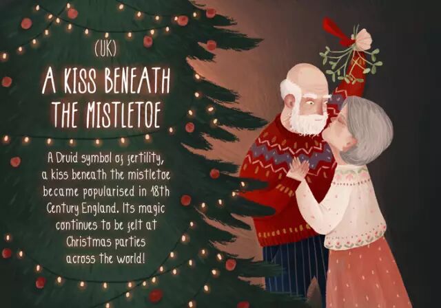 在圣诞节,人们喜欢用槲寄生作为装饰,挂在门口和屋子里。如果你和另一个人站在一束槲寄生下,就必须接吻,不管对方是谁。所以,在圣诞节,要小心你头顶的东西哦。