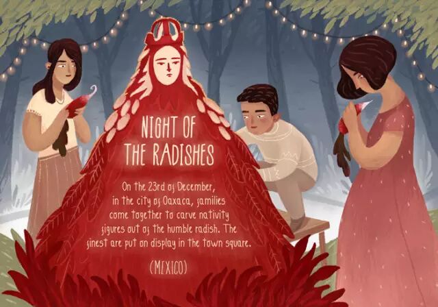12月23日,在瓦哈卡州,家家户户都会聚到一起用小萝卜雕出耶稣降生的雕像,最精美的雕像会被放在市镇广场上展览。