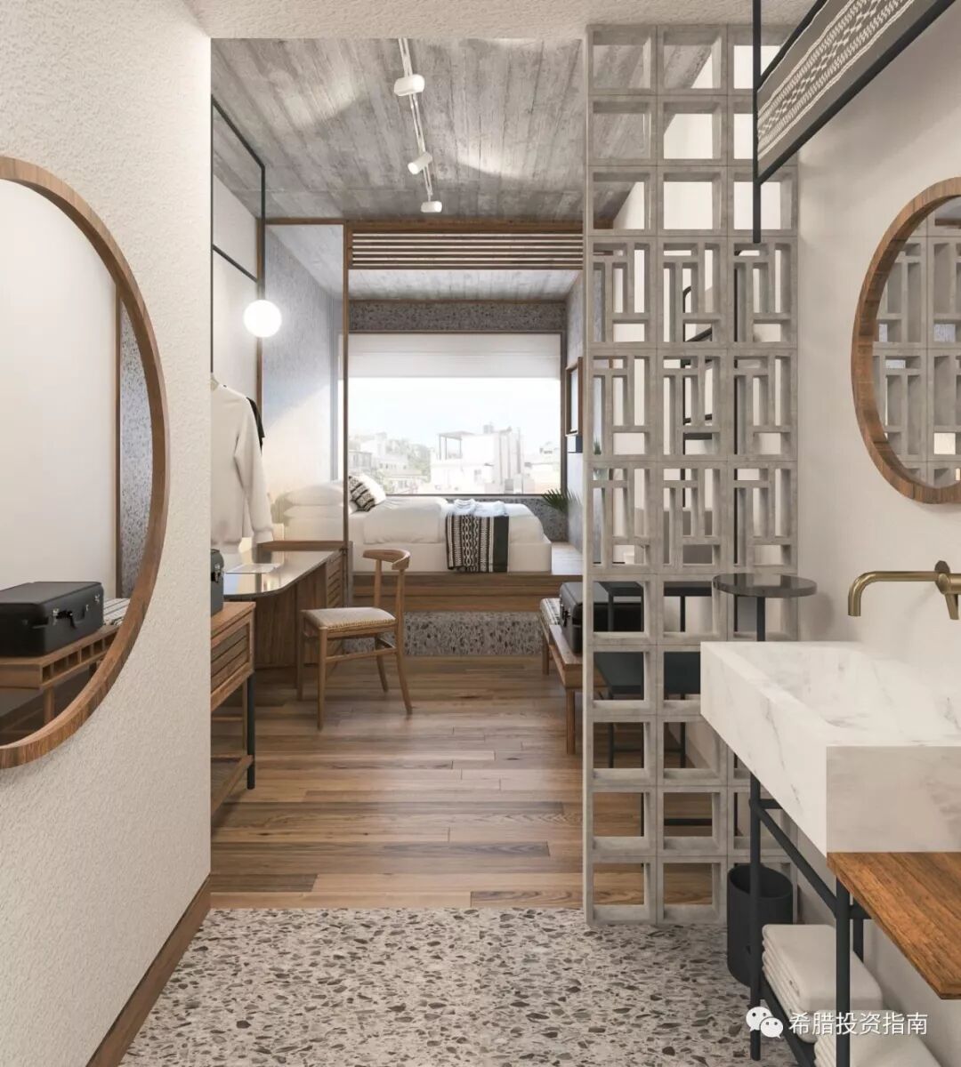 这些空间与当地领先的设计师和艺术家合作,结合希腊人对天然材料的喜爱,传统工艺以及强烈的现代化线条设计。大型双层玻璃窗可以欣赏到帕特农神庙和城市的景色以及Agora的喧嚣。