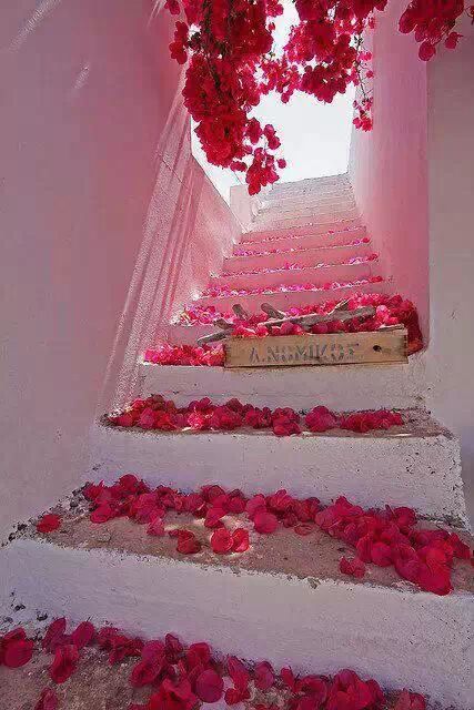 遍地的花瓣,不论是人工的还是风的作品,都那么浪漫。一地火红的爱,伴随着一直向上,到达的是另一片广阔的天地。是爱人的心房,还是神明耀眼的光辉?