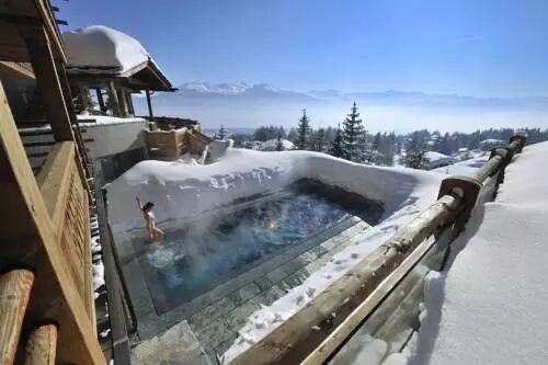 冬天来到瑞士并不意味着就不能享受室外游泳池的乐趣了。拥有室外温水游泳池的LeCrans Hotel & Spa酒店位于瑞士滑雪胜地Crans Montana,酒店拥有阿尔卑斯山和勃朗峰的美景视角。在温热的室外泳池享受冰天雪地的景致与乐趣,简直太惬意~